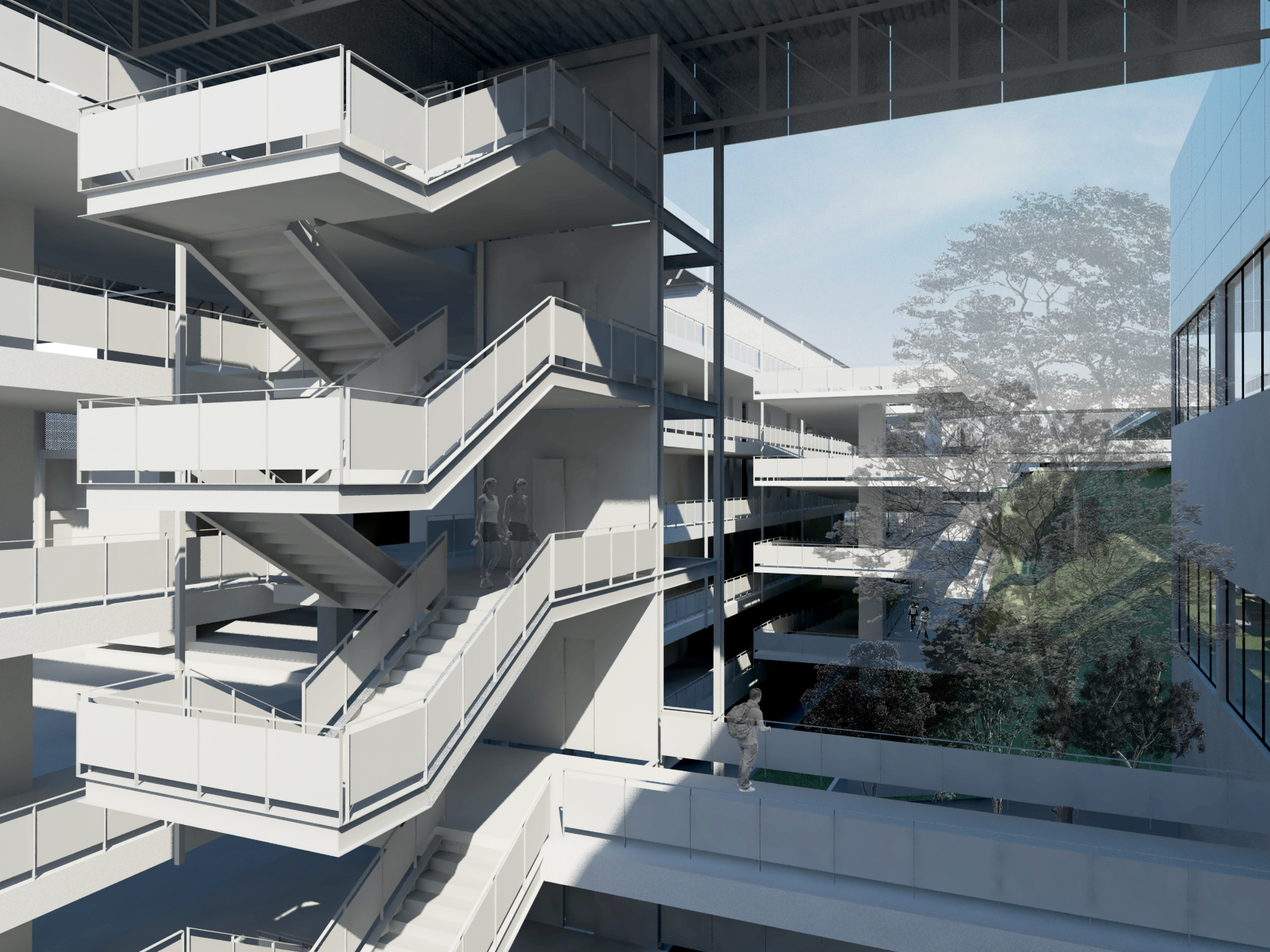 - O desenvolvimento dessa proposta foi orientado pelo Termo de Referência do concurso, sobretudo a partir dos conceitos de visibilidade, transitividade, estímulo/acolhimento, atratividade e reversibilidade, estabelecidos como atributos essenciais do projeto. Dessa maneira o estabelecimento de um sistema nítido de circulação, aliado à lógica funcional na distribuição do programa possibilita uma a rápida percepção dos espaços. A fluidez e continuidade dos caminhos internos criam variabilidade e surpresas na fruição arquitetônica. A permeabilidade da construção com a cidade sempre presente por um lado e o jardim interno por outro garantem para os usuários a orientação espacial desejável. Ao mesmo tempo, e por isso mesmo, contrapõe-se à idéia de cidadela, fechada para a cidade e suas transparências realizam o convite.
