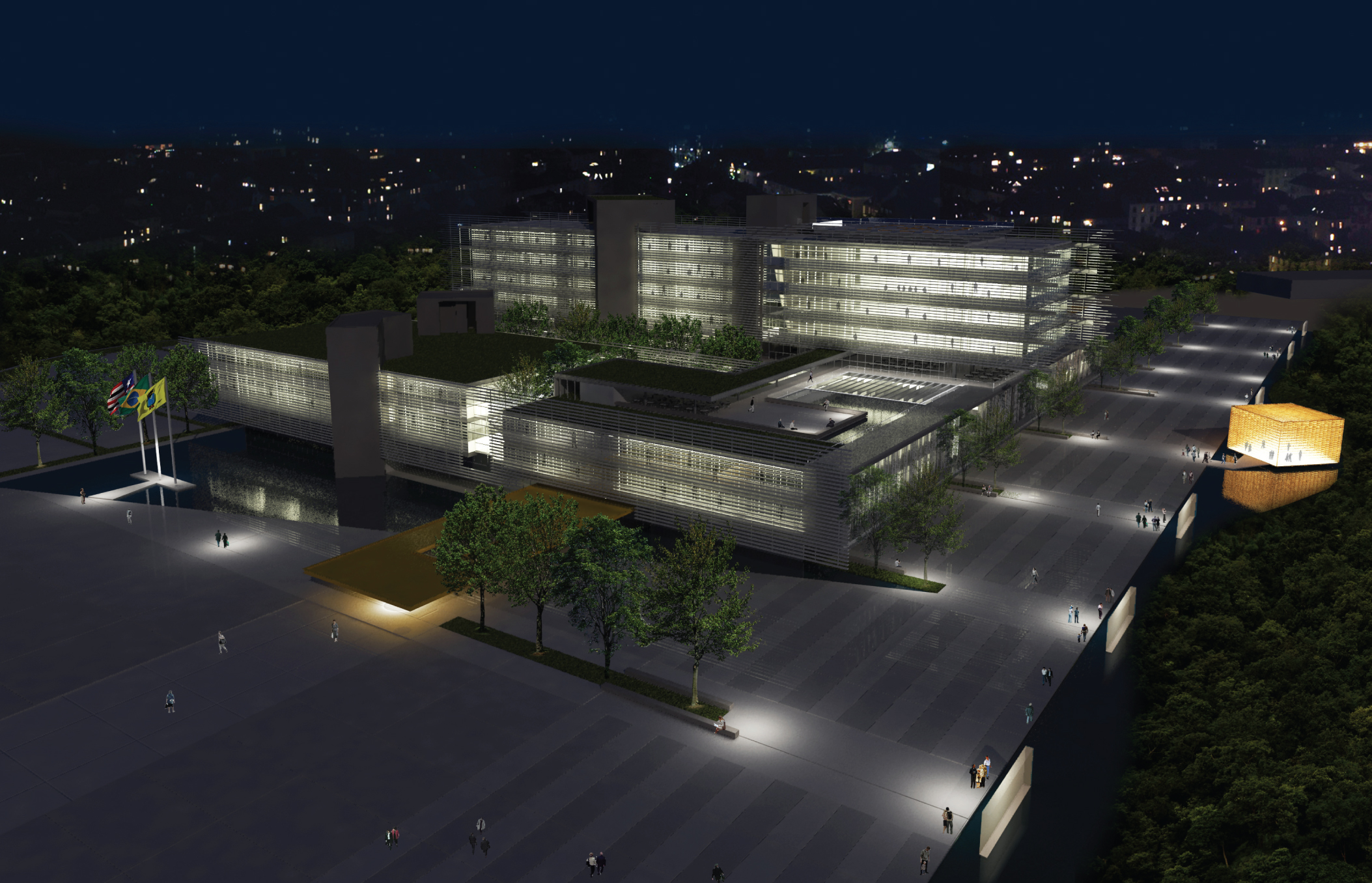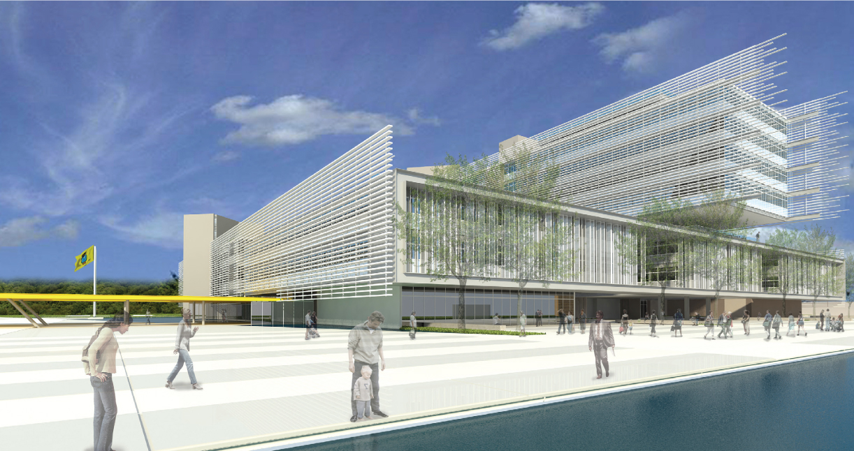 O edifício proposto foi implantado como um anexo dos edifícios existentes, reordenando os alinhamentos e gerando novos espaços de convívio. Isolados e hierarquizados através dos eixos criados, os fluxos e acessos públicos, semi-públicos e privados garantem independência e controle. Veículos acessarão o complexo pelas avenidas euclides de figueiredo e jerônimo de albuquerque, onde estão distribuídas vagas para visitantes e funcionários. Dois subsolos conectados garantem a demanda de vagas cobertas para funcionários e autoridades. Há também o estacionamento térreo para visitantes e funcionários, contíguo à Avenida Euclides de figueiredo, tendo seu acesso principal na confluência com a Avenida Jerônimo de Albuquerque. É importante ressaltar que os fluxos de serviços não conflitam com as atividades diárias da instituição. As autoridades possuem acessos independentes ao edifício pelo 2º subsolo, garantindo, assim, a privacidade que requer o cargo.