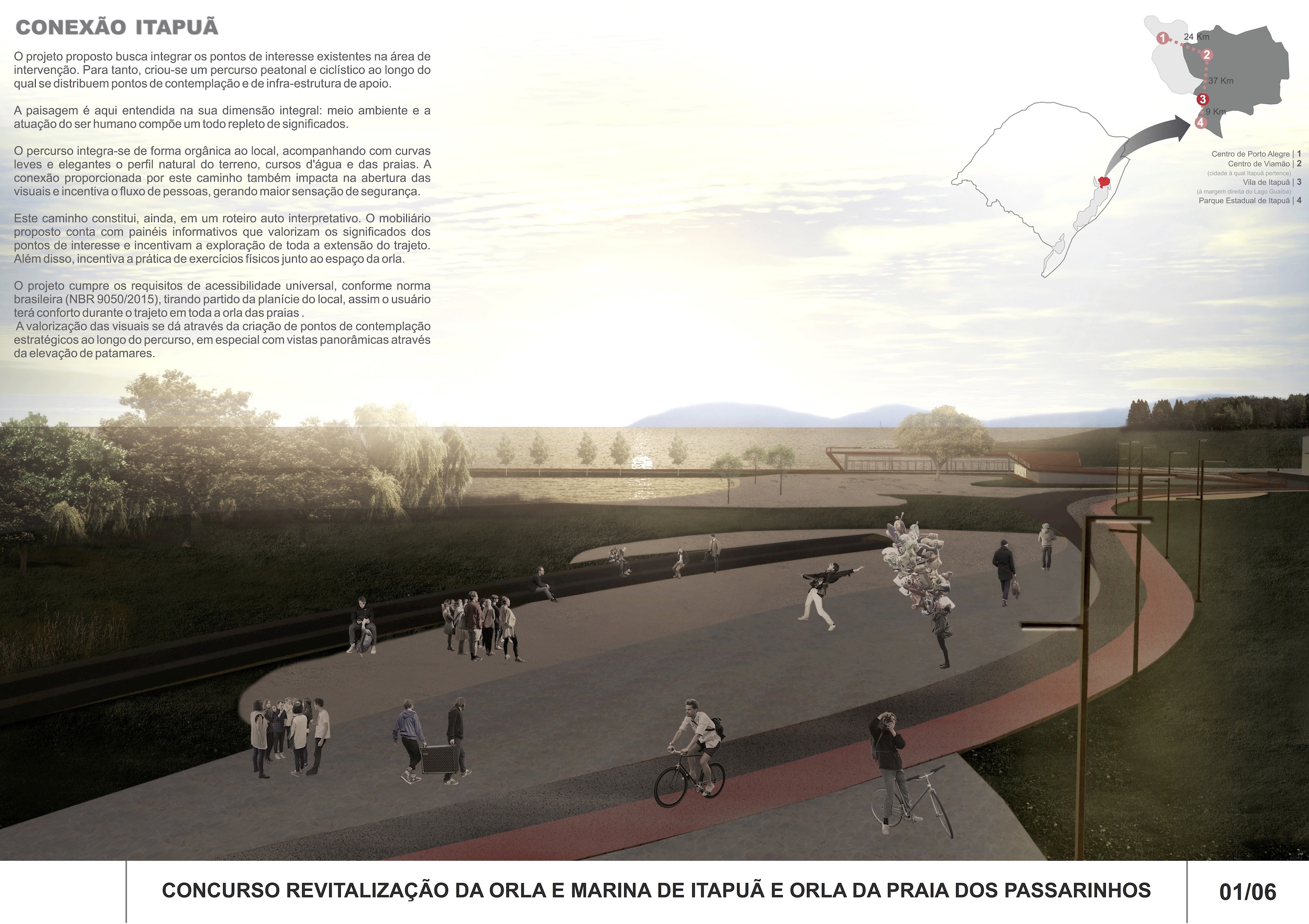 Veja a seguir os premiados e menções do Concurso de Arquitetura para revitalização da orla e marina da Praia de Itapuã e orla da Praia dos Passarinhos, no Rio Grande do Sul, promovido e organizado pela prefeitura municipal de Viamão. Veja aqui a Ata de Julgamento do Concurso.