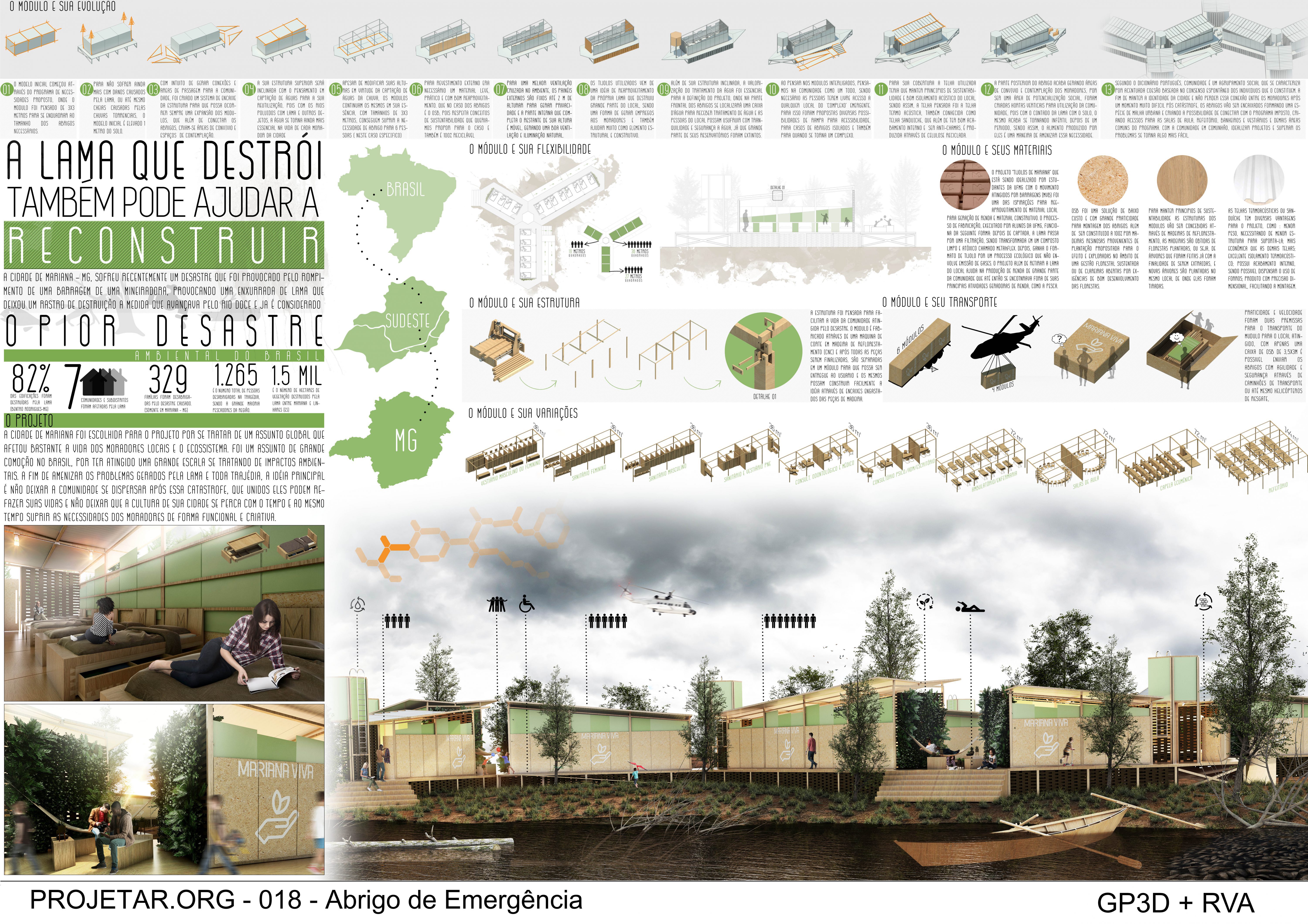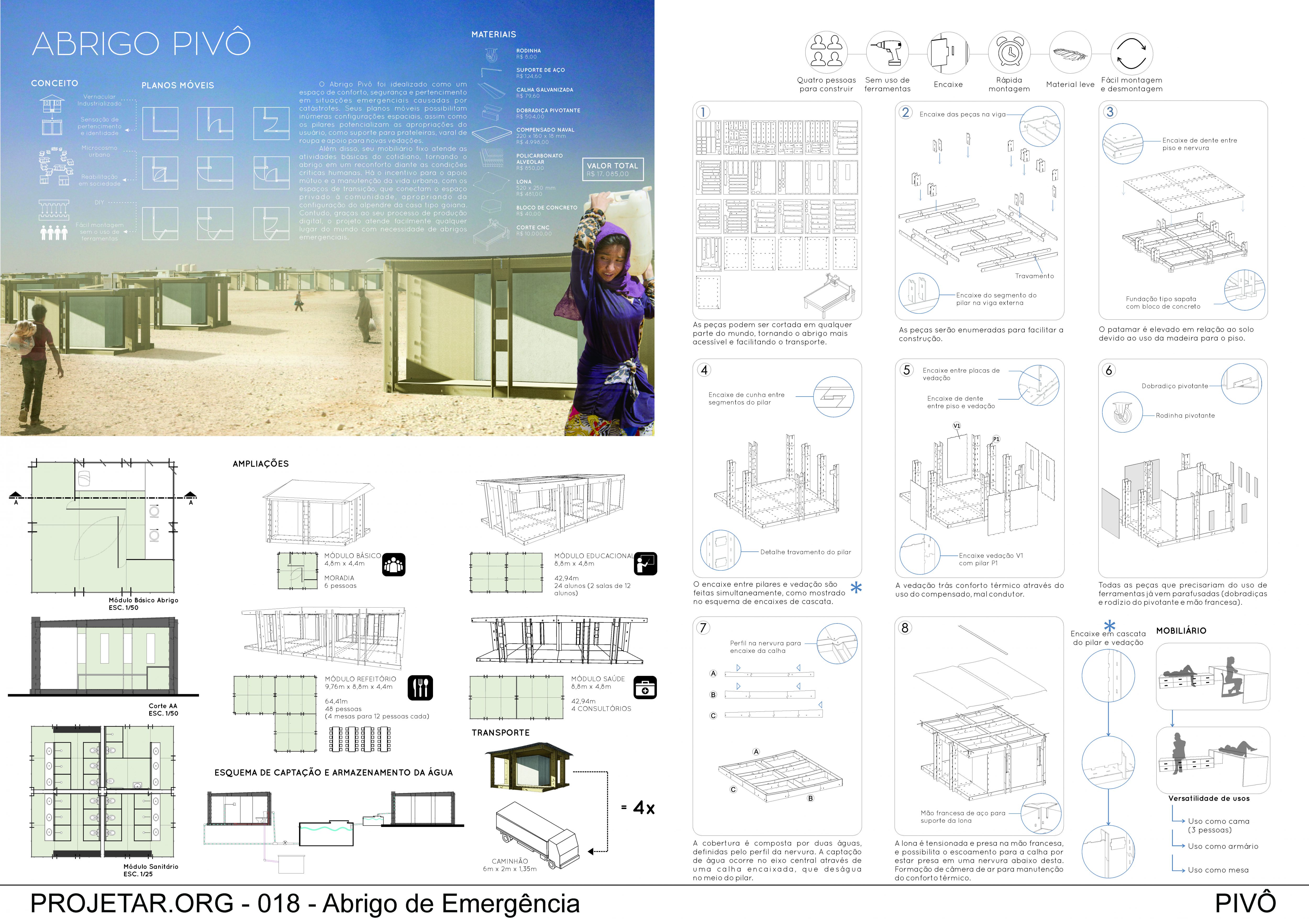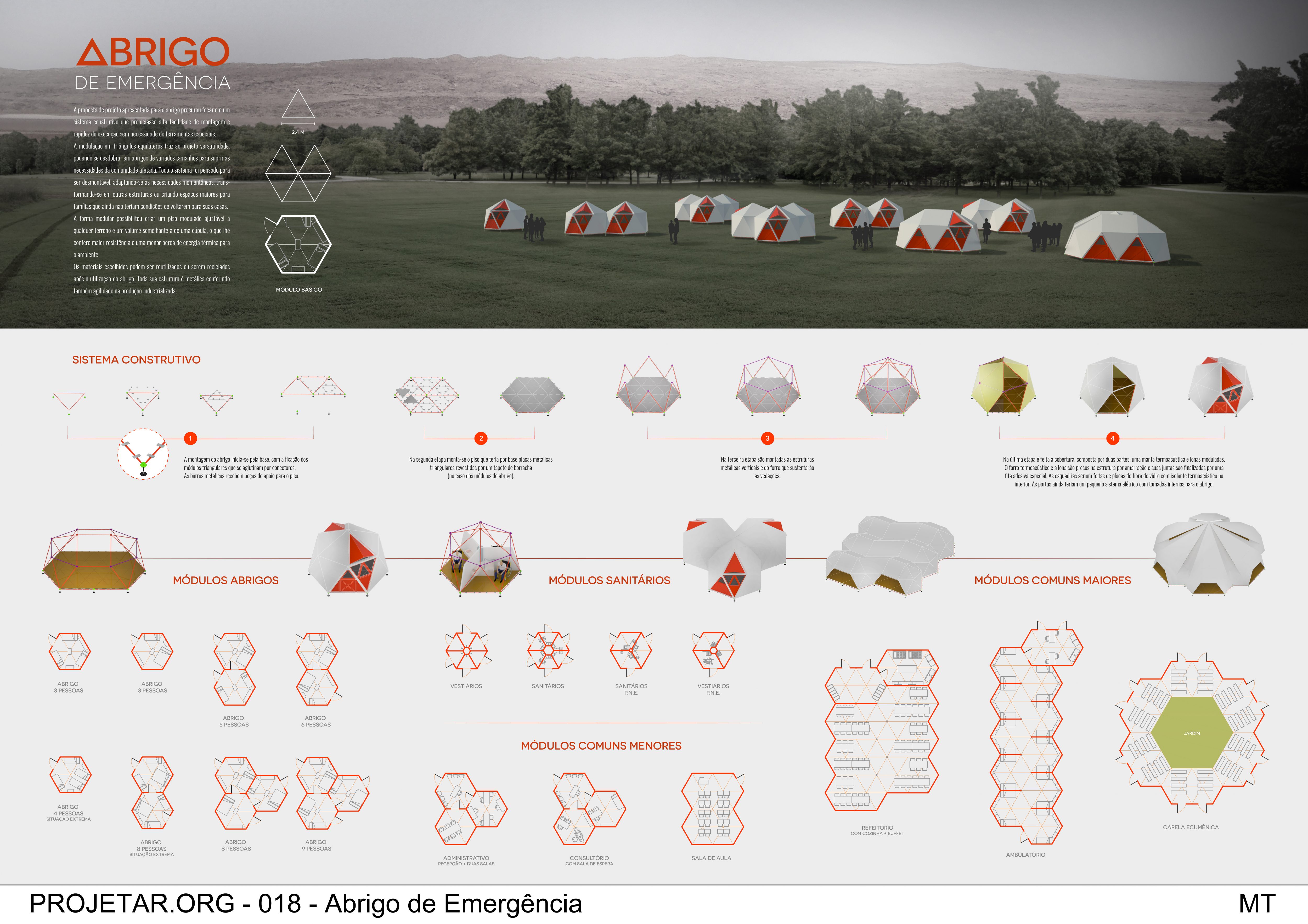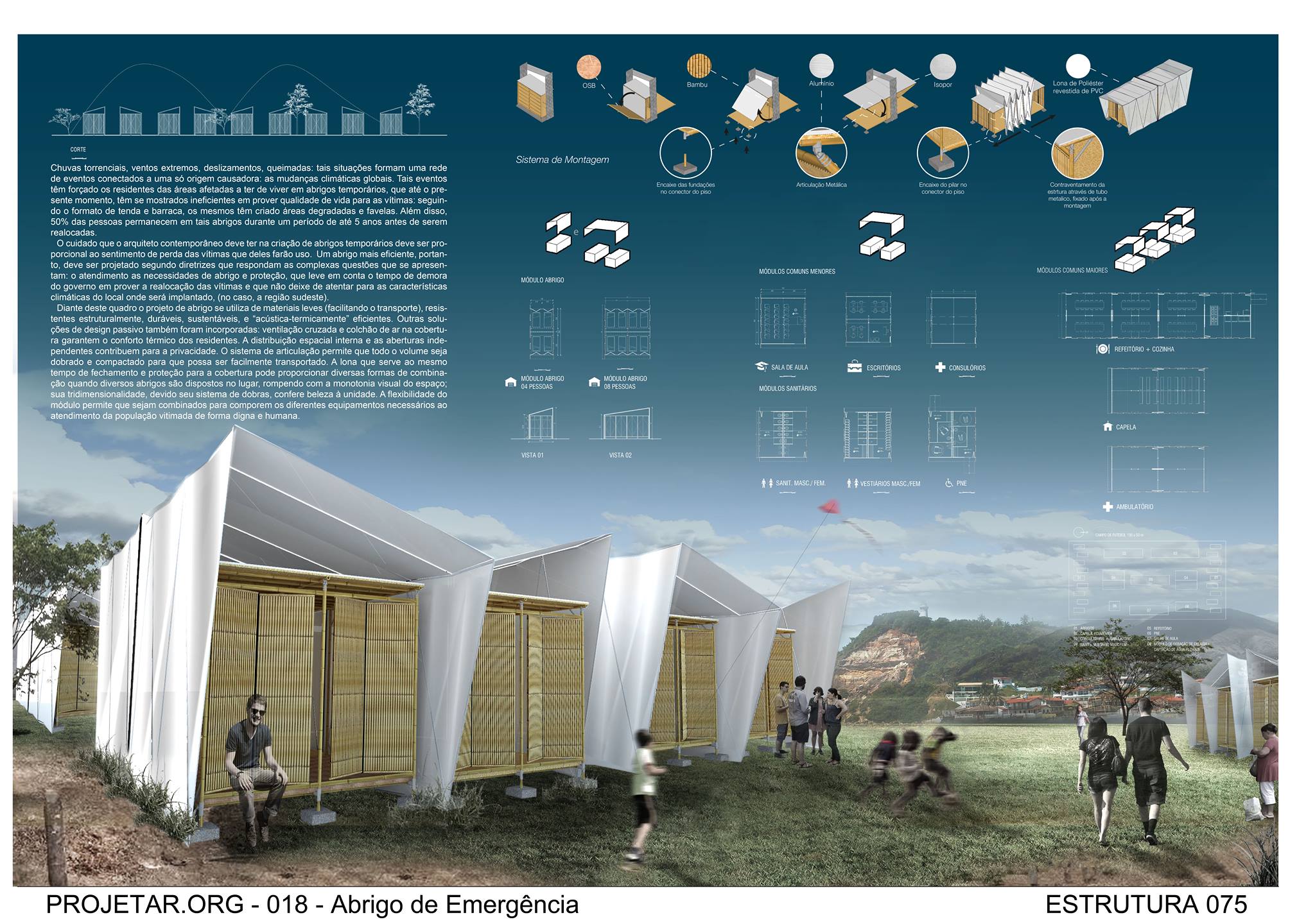 Veja a seguir os projetos premiados e menções do concurso de ideias Abrigo de Emergência, destinado a estudantes de Arquitetura e Urbanismo, promovido e organizado pelo projetar.org. O concurso teve como proposta um abrigo temporário que possa ser utilizado no auxílio de vítimas em casos de emergências como desastres naturais.