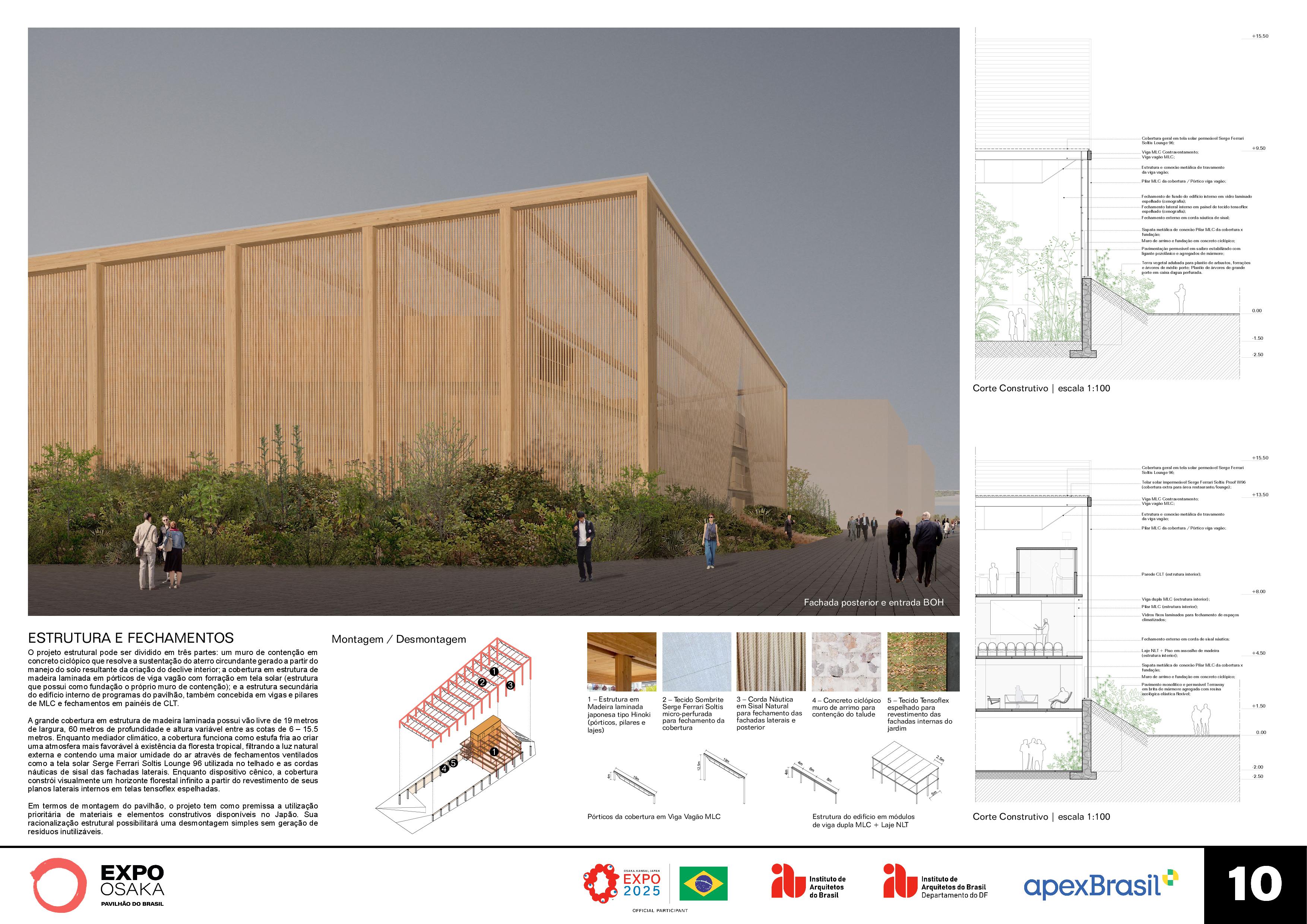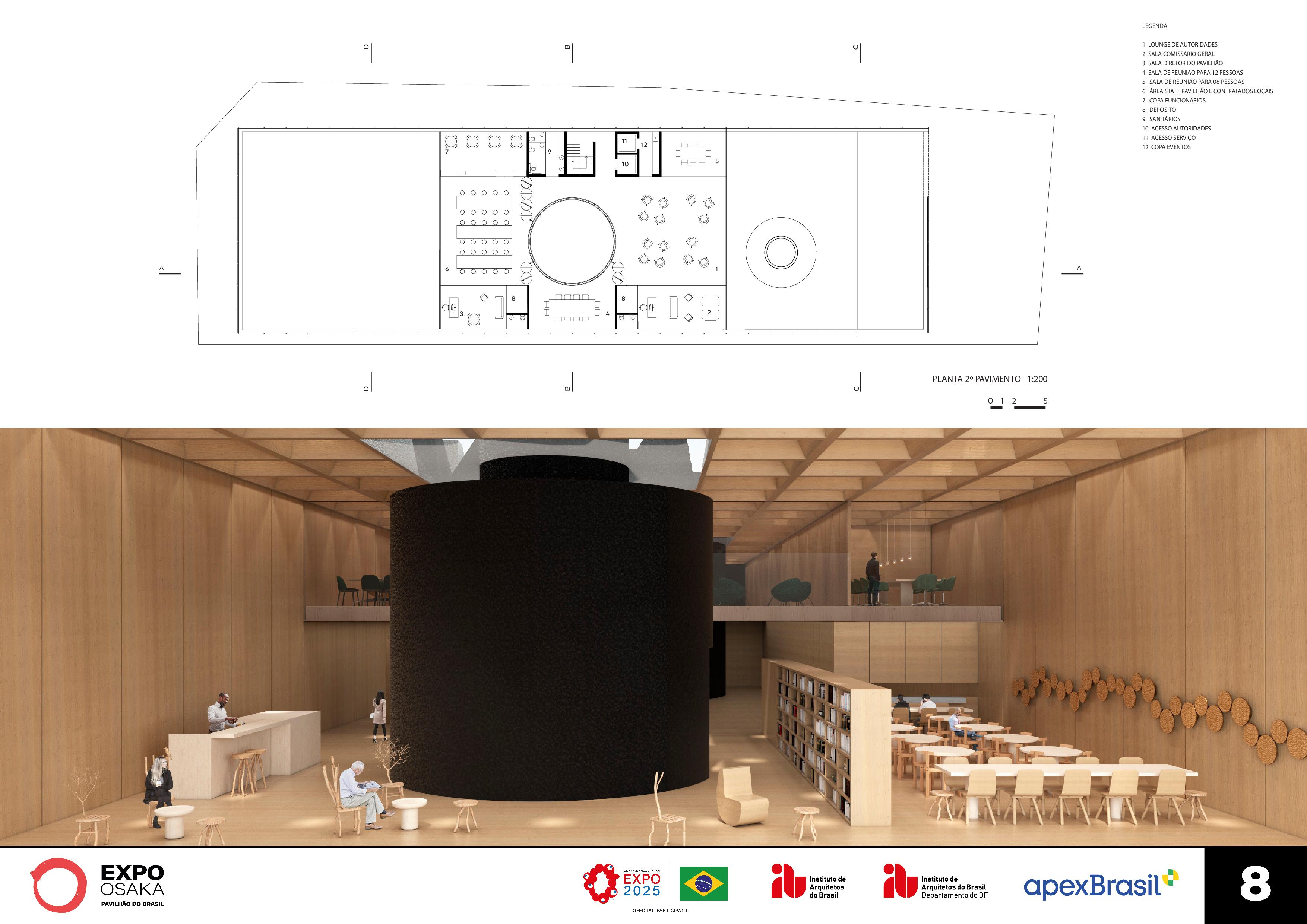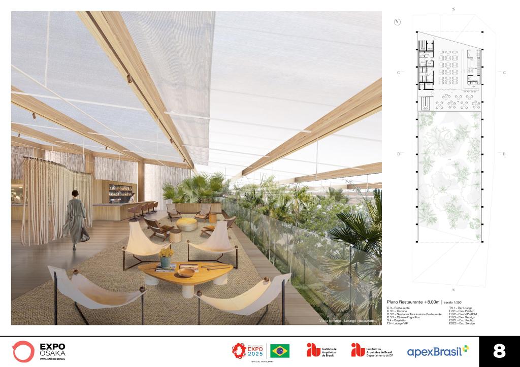 Segundo Lugar – BERNARDES; AGENCIA TPBA – Rio de Janeiro/RJ – Autores: Thiago Bernardes; Francisco Abreu; Thiago de Almeida; Priscila Bellas. Equipe: Curadoria: Kykah Bernardes. Consultoria em Paisagismo: Rodrigo Oliveira, Rodrigo Oliveira e Mariana. Rewood: Consultoria em estrutura; Eng. Carlito Calil Neto; 27+1 Comunicação visual: Consultoria em Expografia; Diretor de Arte Batman Zavareze.
