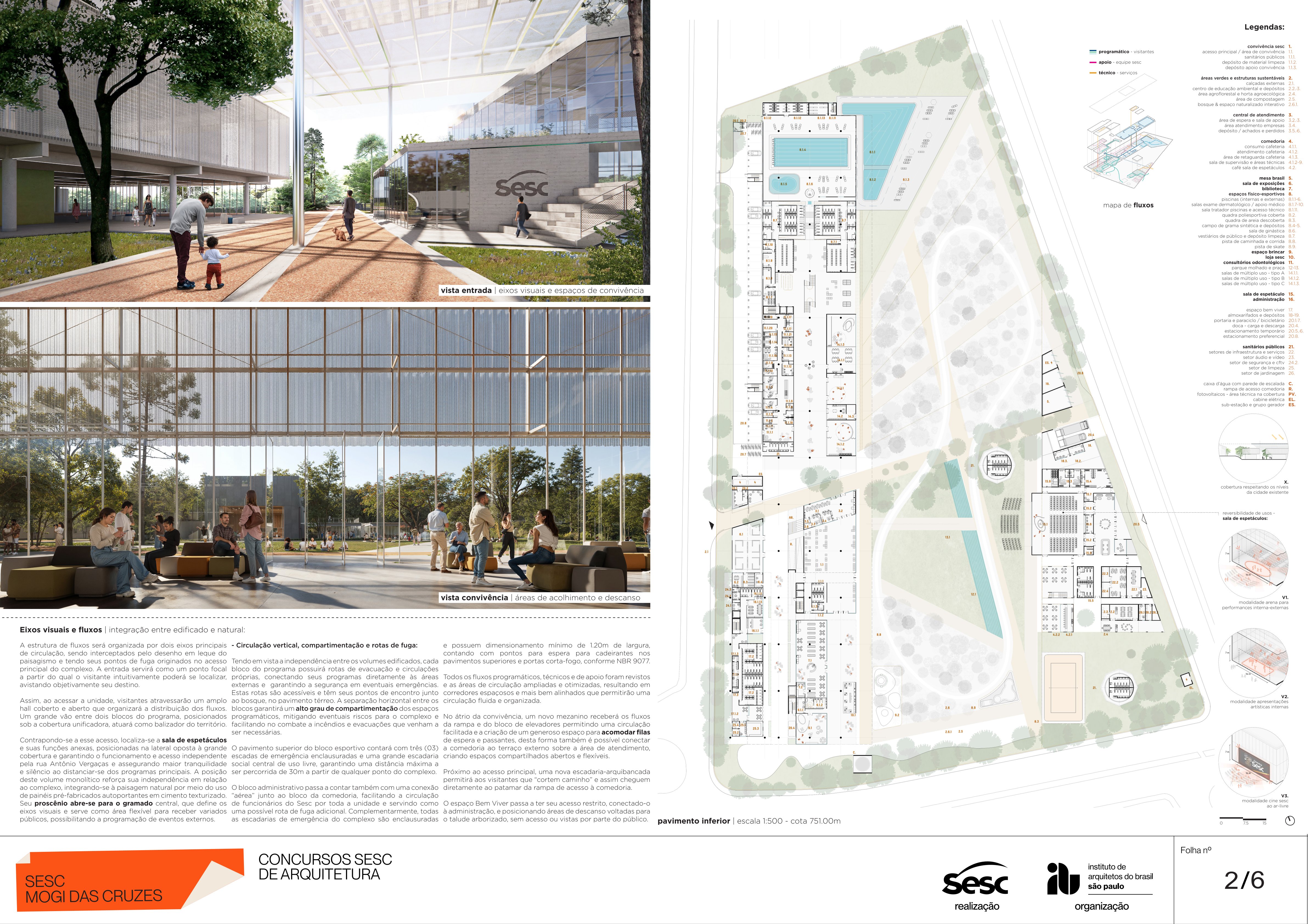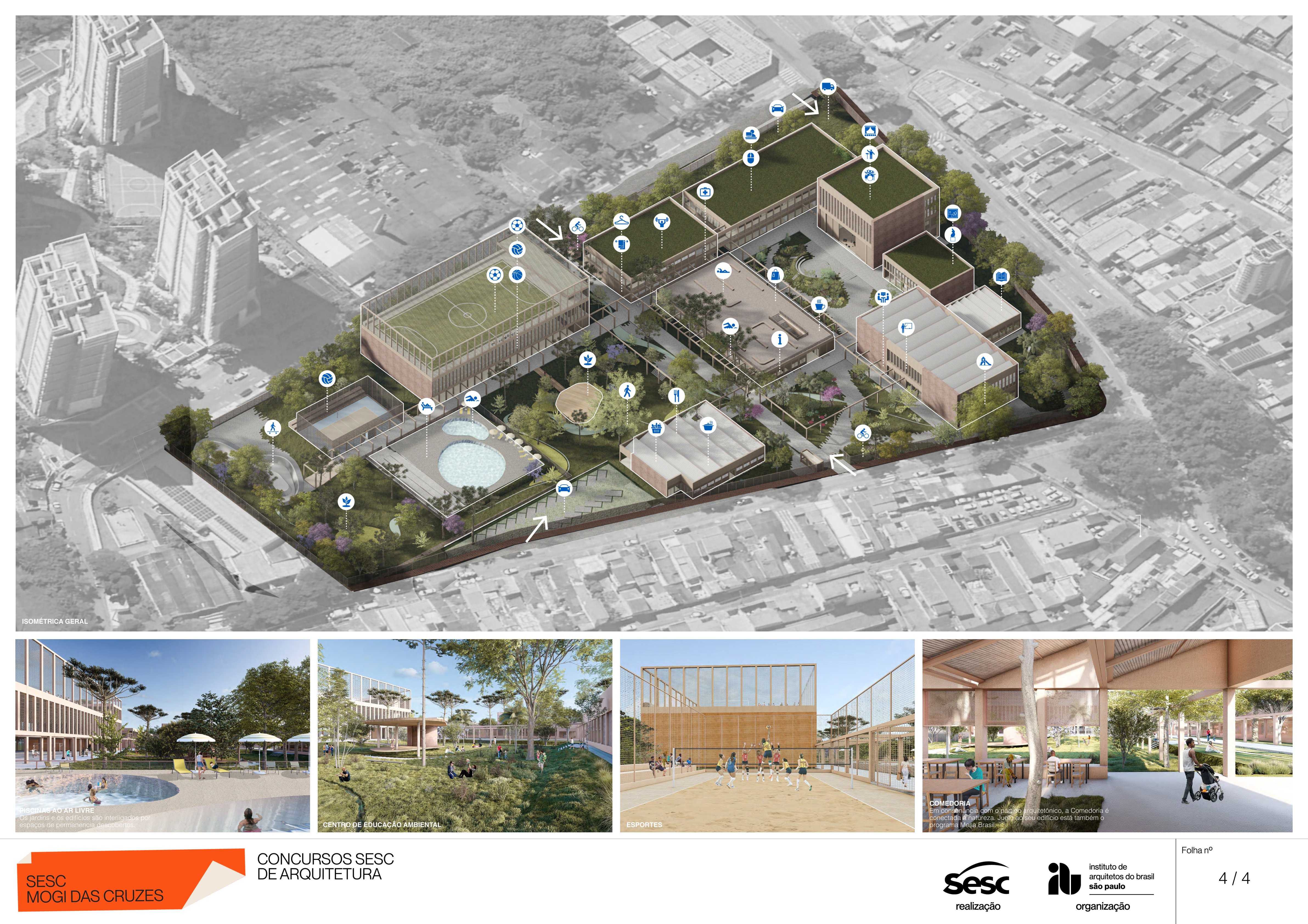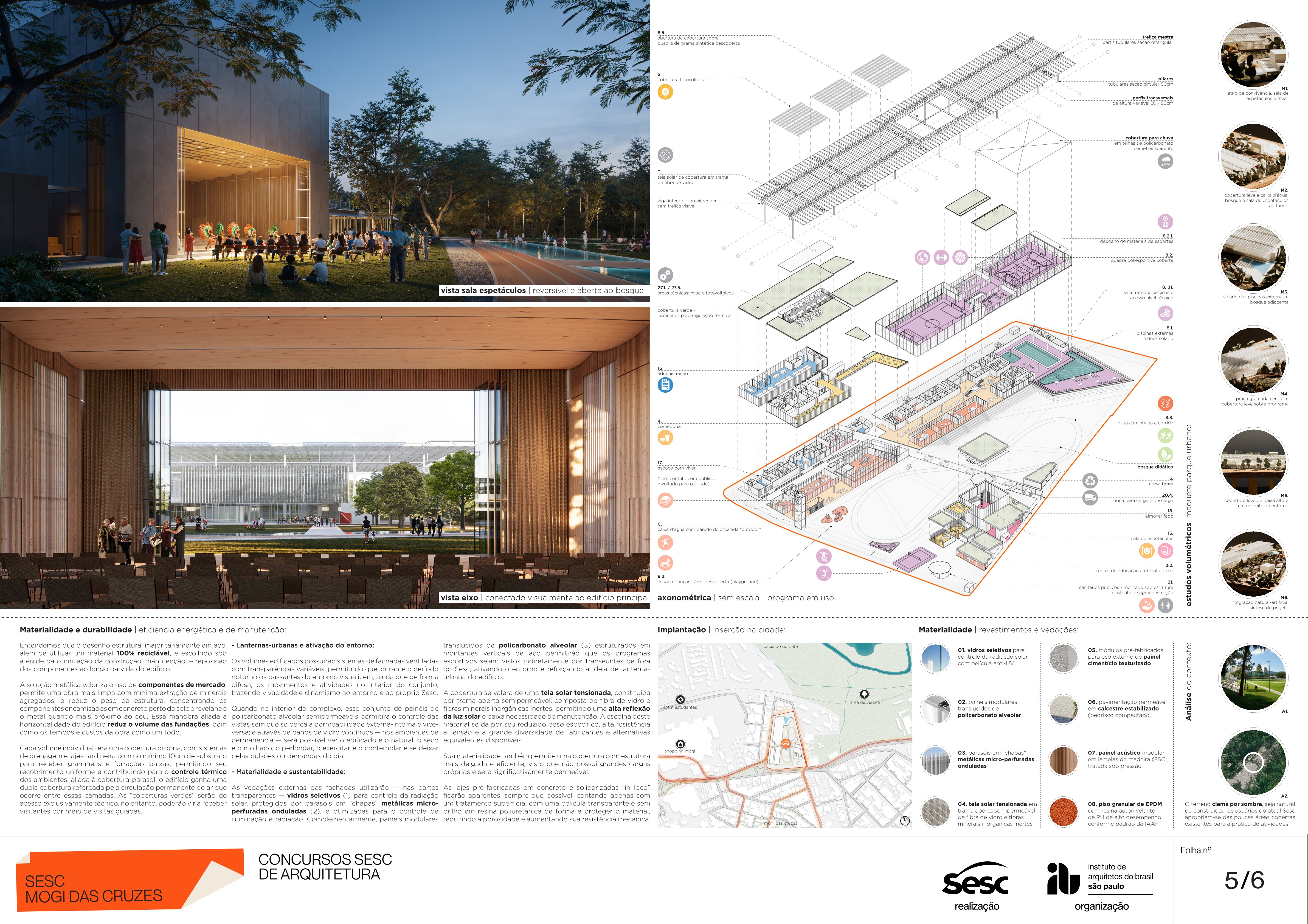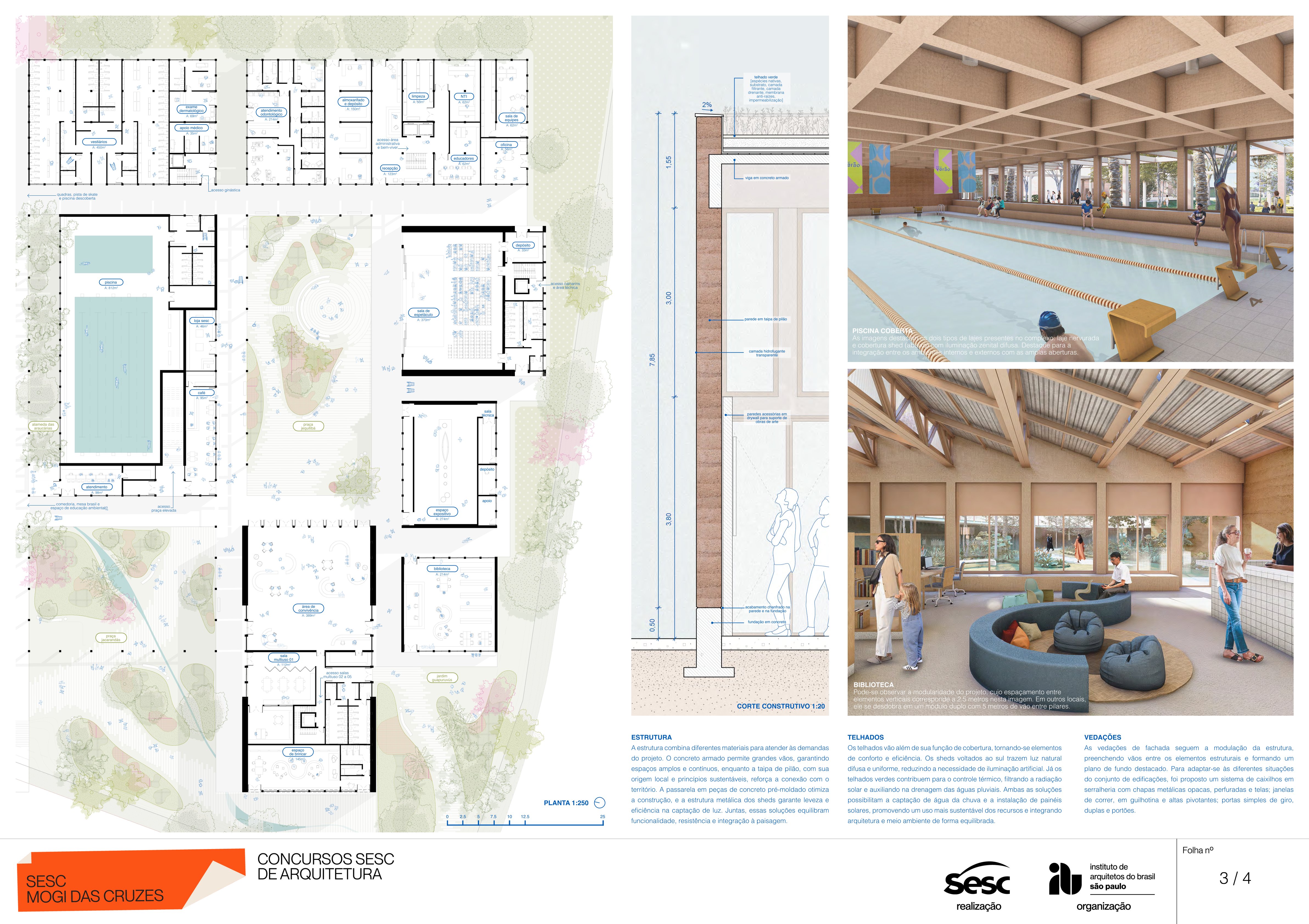 Quarto Lugar – Democratic Architects – São Paulo/SP. Autores: Antonio Roberto Zanolla, Andre Enrico Cassettari Zanolla. Colaboradores: Bianca de Lira Silva, Gabriel Melo Zambroni, Julia Marquez de Souza, Ricardo Hiroyuki Achidate Makino, Thomas Dylan Butler. Consultores: Eduardo Martins Ferreira (Pura Arquitetura) – Consultor de Projetos Institucionais. Jorge Rybka (EngeBrat – Consultoria, Engenharia e Projetos) – Consultor de Estrutura Metálicas. Viviane Almeida Campos (Pqr Ma2 Engenharia) – Consultor de Sistemas Elétricos, Hidráulicos e de Proteção e Combate à Incêndio. Ricardo Vianna (Bonsai Paisagismo) – Consultor de Paisagismo e Agronomia. Francisco Spadoni – Consultor de Projetos Institucionais. Mayra Simone dos Santos – Consultor de Projetos Institucionais. Gustavo Emanoel da Silva (Simultaneo Studio) – Consultor de Arte e Renderização. Gabriel Cunha (Simultaneo Studio) – Consultor de Arte e Renderização. Julia Moran (Simultaneo Studio) – Consultor de Arte e Renderização. Leonardo Regis (Simultaneo Studio) – Consultor de Arte e Renderização. João Paulo Prado – Consultor de Fotografia. Inaê Moraes Teixeira – Consultor de Modelmaking.